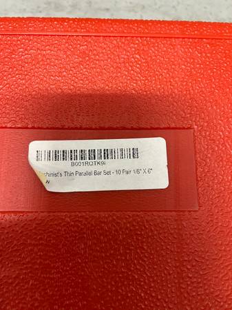 Precision machinist’s thin parallel bar set, 10 matched pairs, each measuring 1/8" thick x 6" long. Hardened and ground steel for high accuracy in setup and inspection. Ideal for milling, drilling, and layout work. Includes protective red storage case.