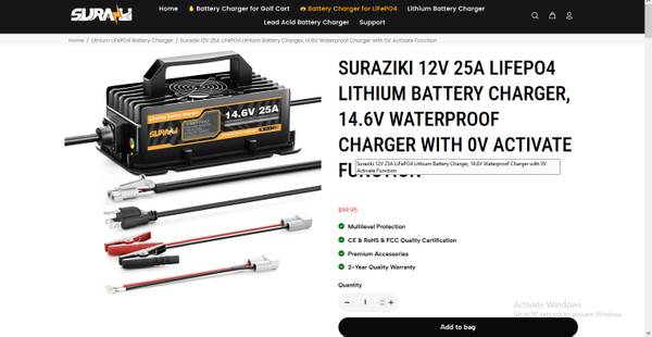 14.6V LiFePO4 battery charger. This is for 12.8V (nominal) LiFePO4 batteries. Charge current: 25 Amps. Condition: New, in original box. Comes with user manual. Made by Suraziki. Retail price: $100...