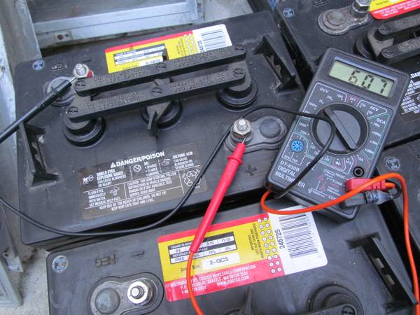 6V Golf cart Flooded Lead Acid (FLA) batteries from Costco. These have removable caps so you can add distilled water for maintenance. I only used these occasionally in the past so they don't have a lot of cycles in them. But I haven't charged them for a few years so they don't hold a charge any more. I just put them back on a charger today and they hold steady at about 6.05V to 6.07V (see picture with the volt meter). I'm selling them as is, for repair only, as they don't hold a charge any more.