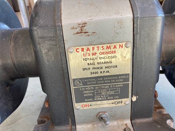 VINTAGE CRAFTSMAN BENCH GRINDER -1/3 H.P. 115 VOLT- WORKS PERFECT - $100 THESE OLD ONES ARE VERY HIGH QUALITY WITH PRECISION BEARINGS AND SHAFT THAT RUNS TRUE UNLIKE THE CHINESE GARBAGE FOR SALE...
