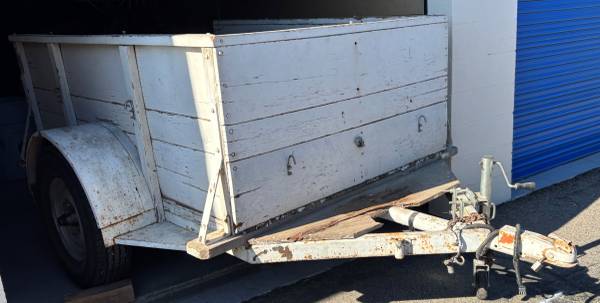 Utility trailer: steel chassis with wood walls, open top, with suspension. Lots of tie down hooks. Included are spare tire, detachable ramps, tarps, net, and tie down ropes. Shown by appointment.