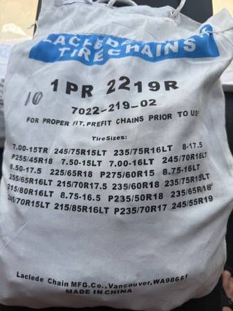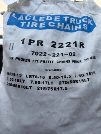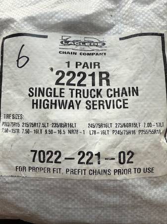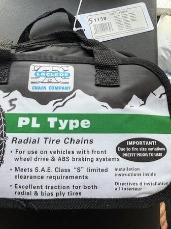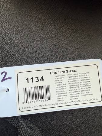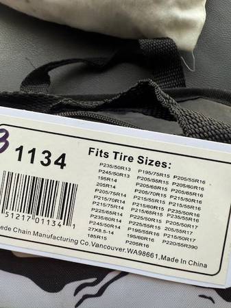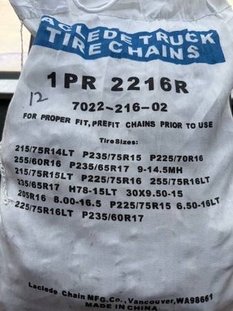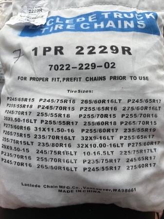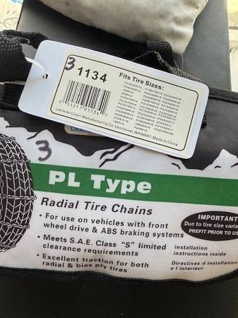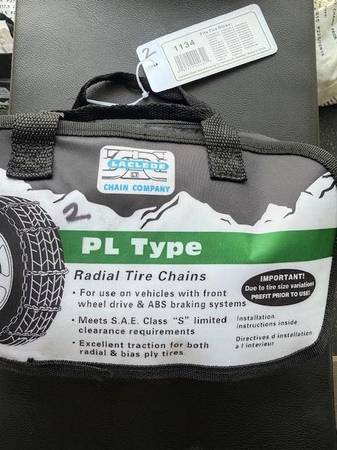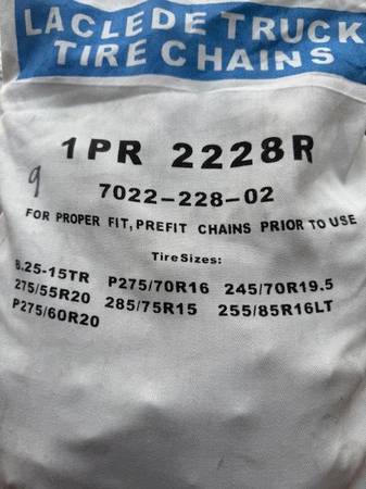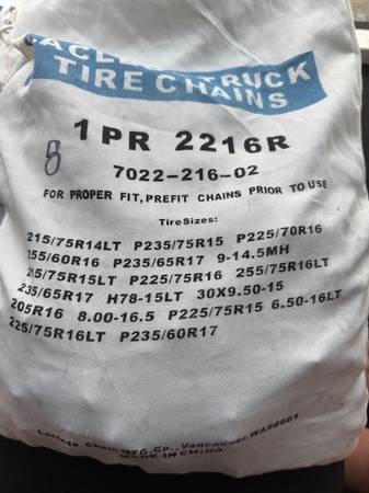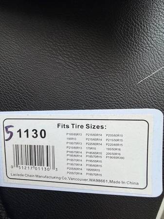 I have several sets of new snow chains. Sizes are listed on each bag in the photos. Tire sizes are listed on each bag; I don't know sizes so do your homework and let me know which number you want (in sharpie on the top left of the bag). Many different sizes in brand new, unopened bags. You are responsible for accurate tire size and fit.
