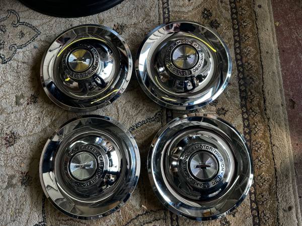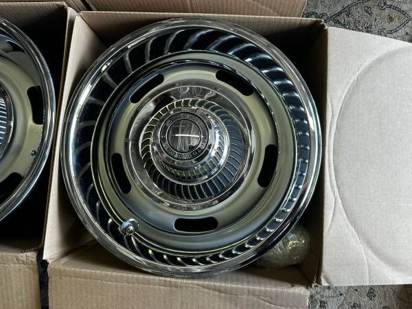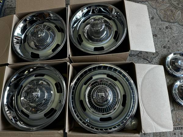 RESTORED SET WITH NEW TRIM RINGS AND NEW METAL DERBY CAPS OR DISC BRAKE CAPS YOUR CHOICE AND LUGS AND STEMS