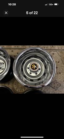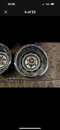 COMPLETE SET WITH NEW TRIM RINGS CAPS AND CHROME LUGS AND CHROME VALUE STEMS.