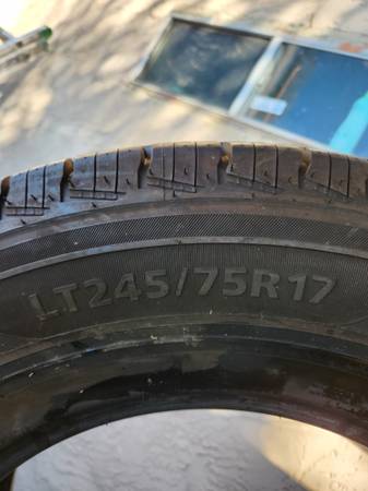 I have ONE used tire for sale lT245-75-17 with good tread. Slling IT for $60.00 Tire Only $80 Mounted and balanced By appointment only. ****FIRM ON PRICE*** Available evenings and weekends Message...