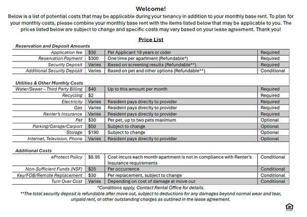Price shown is Base Rent. Residents are required to pay the following: Application Fee ($30.00 Per Applicant 18 years or older, One-Time, At Application), Reservation Payment ($300, One time per apartment, Refundable*), Security Deposit (Varies, Based on screening results, Per Apartment, Refundable**), Additional Security Deposit (Varies, Based on pet and other options, Refundable**, Water/Sewer (Up to $55 per month per apartment, Utility, Usage Based, Nonrefundable), Recycling ($2 per month per apartment, if applicable, Nonrefundable), Electricity/Gas (Varies, Usage Based, Utility, Resident pays directly to provider), Renter’s Insurance (Varies, Resident pays directly to provider). Optional charges that may be applicable to the resident are as follows: Pet ($30 Per pet per month, Up to two pets maximum, Nonrefundable), Parking/Carport/Garage/Storage (Varies per property, per month, Subject to change, Nonrefundable, Refundable** deposit may apply), Internet, Television, Phone (Varies, Utility, Resident pays directly to provider), eProtect Policy (Up to $30, Cost incurs each month apartment is not in compliance with Renter’s Insurance requirements, Nonrefundable), Non-Sufficient Funds (NSF) ($25 Per occurrence, Nonrefundable) Key/FOB/Remote Replacement (Varies per property, Per replacement, Subject to change, Nonrefundable), Positive Rental Payment Credit Reporting ($2.00 per month per resident, Resident pays directly to CredHub, Nonrefundable), Turn Over Cost (Varies, Depending on cost of damage at move out). *Conditions apply. Contact Rental Office for details. **The total security deposit is refundable after move out, subject to deductions for any damages beyond normal wear and tear, unpaid rent, or other outstanding charges as outlined in the lease agreement.