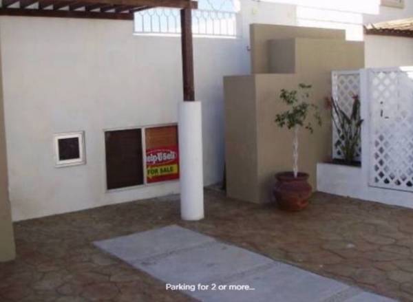Small enclosed yard with covered patio. Secure stamped concrete carport for two vehicles. Mediterranean-style home.