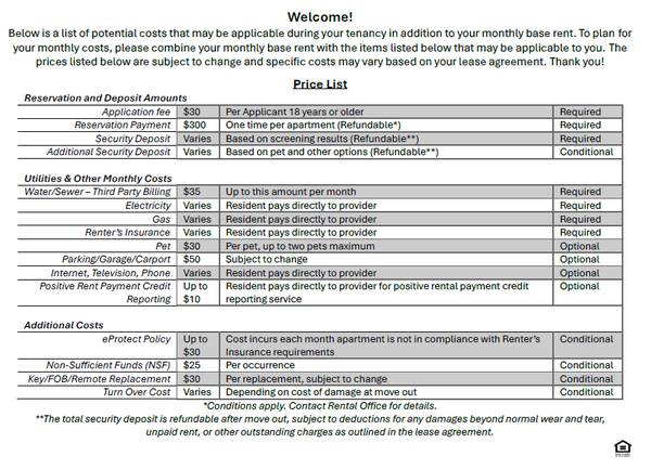 Price shown is Base Rent. Residents are required to pay the following: Application Fee ($30.00 Per Applicant 18 years or older, One-Time, At Application), Reservation Payment ($300, One time per apartment, Refundable*), Security Deposit (Varies, Based on screening results, Per Apartment, Refundable**), Additional Security Deposit (Varies, Based on pet and other options, Refundable**, Water/Sewer (Up to $55 per month per apartment, Utility, Usage Based, Nonrefundable), Recycling ($2 per month per apartment, if applicable, Nonrefundable), Electricity/Gas (Varies, Usage Based, Utility, Resident pays directly to provider), Renter’s Insurance (Varies, Resident pays directly to provider). Optional charges that may be applicable to the resident are as follows: Pet ($30 Per pet per month, Up to two pets maximum, Nonrefundable), Parking/Carport/Garage/Storage (Varies per property, per month, Subject to change, Nonrefundable, Refundable** deposit may apply), Internet, Television, Phone (Varies, Utility, Resident pays directly to provider), eProtect Policy (Up to $30, Cost incurs each month apartment is not in compliance with Renter’s Insurance requirements, Nonrefundable), Non-Sufficient Funds (NSF) ($25 Per occurrence, Nonrefundable) Key/FOB/Remote Replacement (Varies per property, Per replacement, Subject to change, Nonrefundable), Positive Rental Payment Credit Reporting ($2.00 per month per resident, Resident pays directly to CredHub, Nonrefundable), Turn Over Cost (Varies, Depending on cost of damage at move out). *Conditions apply. Contact Rental Office for details. **The total security deposit is refundable after move out, subject to deductions for any damages beyond normal wear and tear, unpaid rent, or other outstanding charges as outlined in the lease agreement.