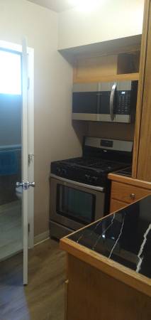 Completely Remodeled! Air conditioning. Luxury vinyl plank flooring and ceramic tile throughout. Full size stainless steel appliances with over range microwave. Lots of interior storage. Apartment is located in the back of the building.