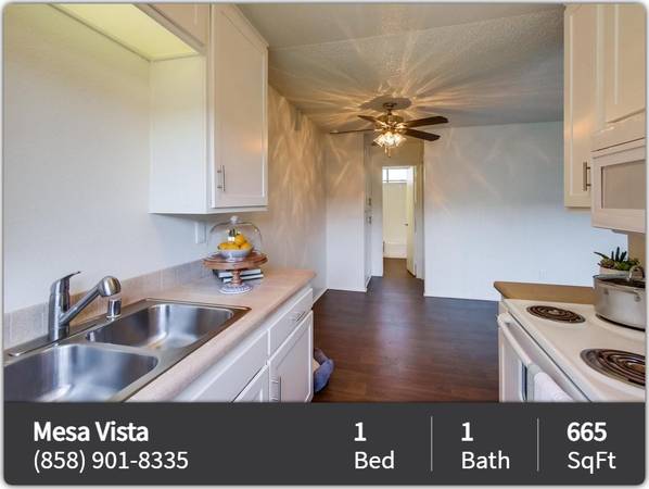 Let the inviting waters of the resort-style pool at Mesa Vista Apartments welcome you home. Bask in the warm rays of the sun in the modern lounge furniture, while cooking a delicious picnic meal on a BBQ fit for a chef. Enjoy beautiful tree-lined streets in the surrounding neighborhood while being minutes from all the shops, café's and restaurants the Clairemont Mesa district has to offer. Try a Thai tea at Boba Time, don't miss the Banh Mi at K's Sandwiches, or enjoy the unique food service as you grab a sushi roll from the conveyor belt at Kura Revolving Sushi bar.