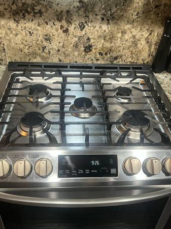 LG 30” gas slide-in stove with 5 burners and stainless top.