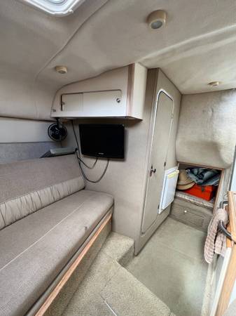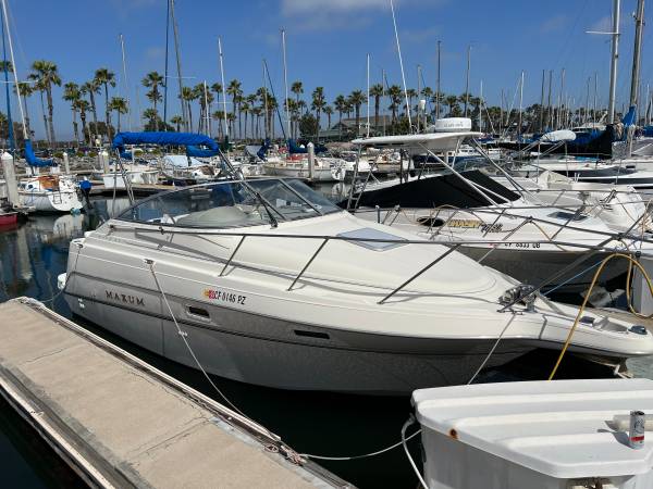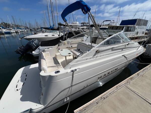 This is a 1999 Maxum 2400 SCR with Mercruiser 250 HP 5.7 L Marine Gasoline Engine with 580hrs and trailer included (not pictured). Runs great and is ready to go! Has a new Bimini top and a recently repaired boat cover. Has front v-birth/table set up, stove, sink, bathroom with sink, toilet, shower, underneath double bed, and upper captain area seating folds flat. Always maintained by a professional mechanic. Recently had the following services: