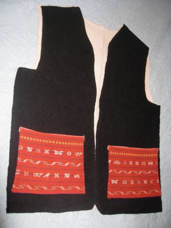 Two vests completely hand made of wool, beautifully decorated, new, clean, never worn and in excellent condition. Both have the same kind of backing, $10 each.
