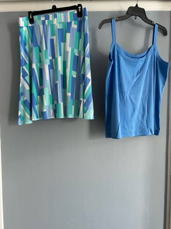 Blue tank top and skirt (blue, powder blue, and white) Both are brand new never worn Purchased in a boutique in Coronado