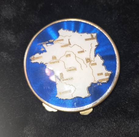 I am selling a Vintage French Compact with a white enamel on plastic picture of France. It is in excellent condition. Great gift for someone who collects these dainty items.