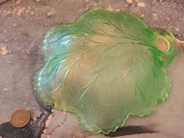 Vintage Indiana Glass Green Uranium Pebble Leaf Handled Nappy BowlThe distinctive green color and tendency to glow under UV light indicate it's made from uranium glass, often referred to as...