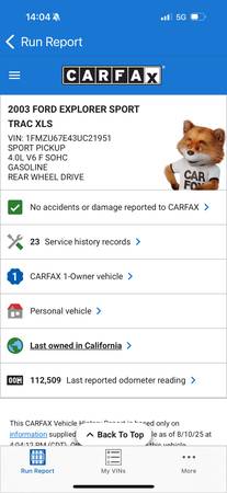 2003 Ford Sport Trac, clean title, runs excellent, no issues, very low miles, 121k, impeccable inside out!! 1 OWNER TRUCK, have the Carfax report for maintenance records, comes with a 3 month warranty!!