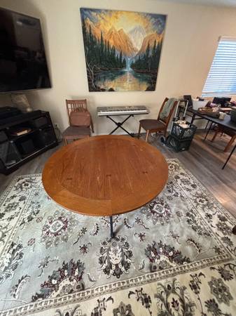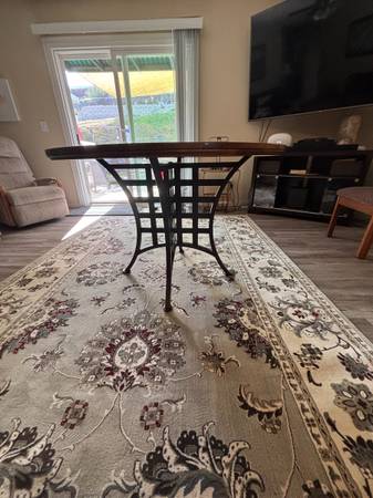 44” round 30” high. Solid Hard Wood Top with Metal legs.