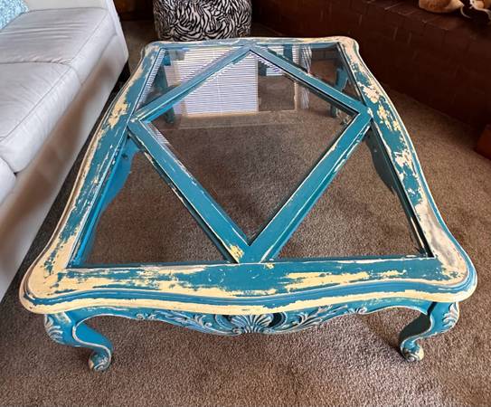 Vintage solid wood and glass beachy shabby chic coffee table with sea shell design. Dimensions: 49 1/2” L 39” W 16 1/2” H Local pick up in La Mesa