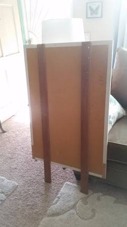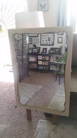 Wood framed mirror for a vanity or dresser with back mounting supports. Off white cream color with inner gold accent around curved edge of the wood frame. Can be painted if you want to change the...