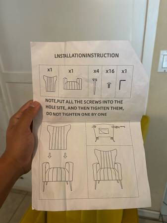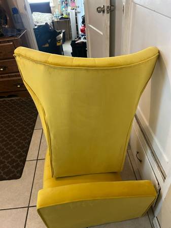 Brand new yellow accent chair with a bold, modern design and high backrest. Upholstered in velvet-like fabric. Includes gold metal legs, screws, and assembly instructions. Never used. Everything...
