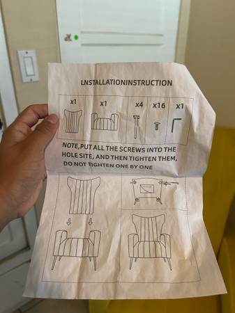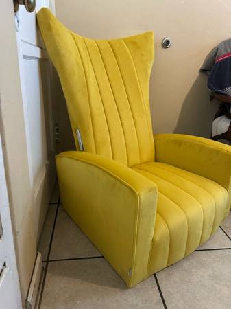 Brand new yellow accent chair with a bold, modern design and high backrest. Upholstered in velvet-like fabric. Includes gold metal legs, screws, and assembly instructions. Never used. Everything...
