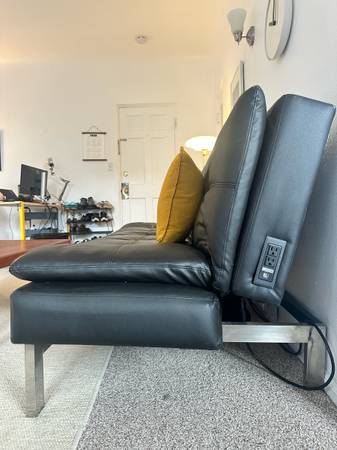 Sofa/futon folds flat and is good to use as guest bed. It has some cracking as seen in the pictures. The headrests also fold flat or can be propped up as seen. There is a cord to plug it in and have...