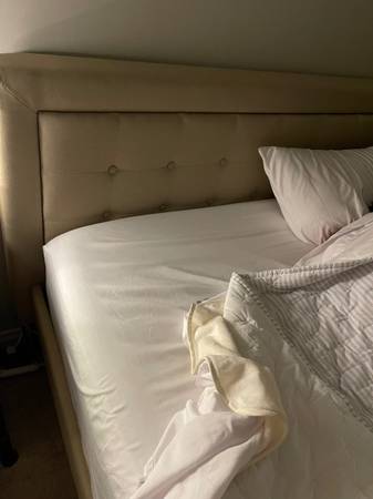 Upolstery bed frame, beige linen, modern, new, size queen. Bought for spare room display never used. 6 mo. old. Frame only does not include mattress.