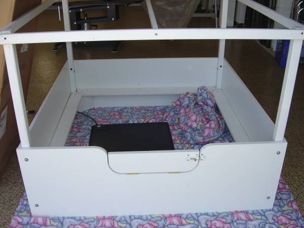 QUESTIONS - Please Phone, Text and Leave Voice Message - Please no email it is not reliable at this time. Call a couple times, sometimes takes us a while to get to the phone. We will check regularly for text or voice messages. Good idea to call a couple times case we don't get to the phone fast. Retired Breeders for decades and after trying other whelp boxes, this set up turned out to be our favorite. Used but still in close to NEW condition. 48" x 48" comes with pig rails, removable fitted top, special heat pad that keeps the area at the right temperature, plus flooring pads etc. All comes with the original boxes for easy storage when you are not using it. Sets up quick and easy. Be sure to view all pictures, several are attached.