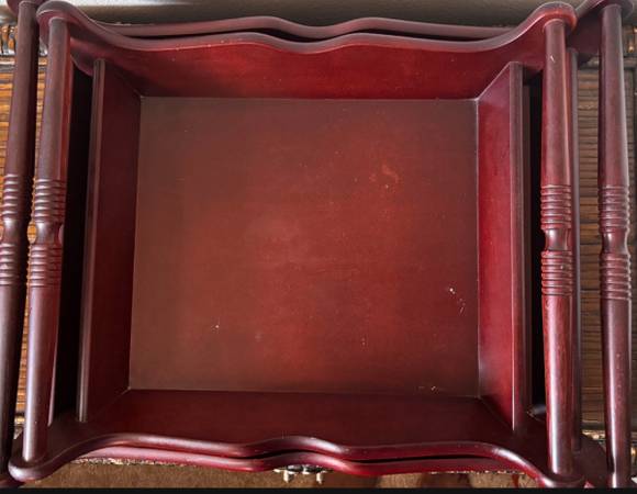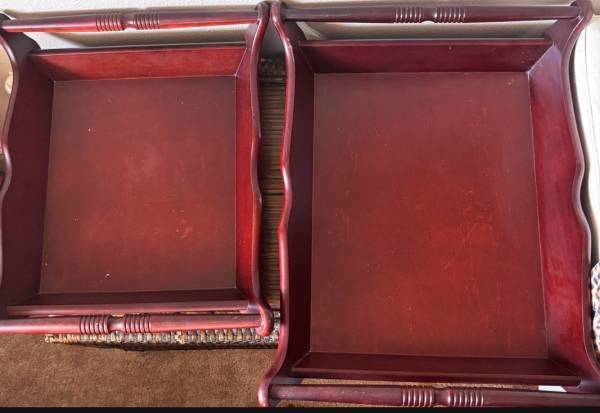 This is a beautiful and functional set of nesting wood trays with a classic, traditional design. Perfect for use as side tables, serving trays for entertaining, or as a decorative accent in any room. Can't confirm but consistent with The Bombay Company.