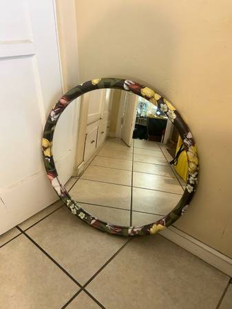 Add a bold, tropical touch to any room with this eye-catching round wall mirror featuring a vibrant floral-patterned frame. Measures approximately 28 inches in diameter. Perfect for bedrooms,...