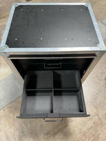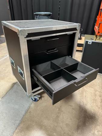 Hand made in san diego using high quality materials 1/2” Film Faced High Quality Birch with Black Hexa Pattern 4 Padded Drawers with removable dividers 4” Rubber Caster Wheels sitting on a removable...
