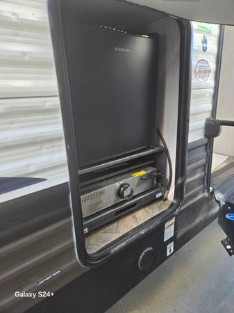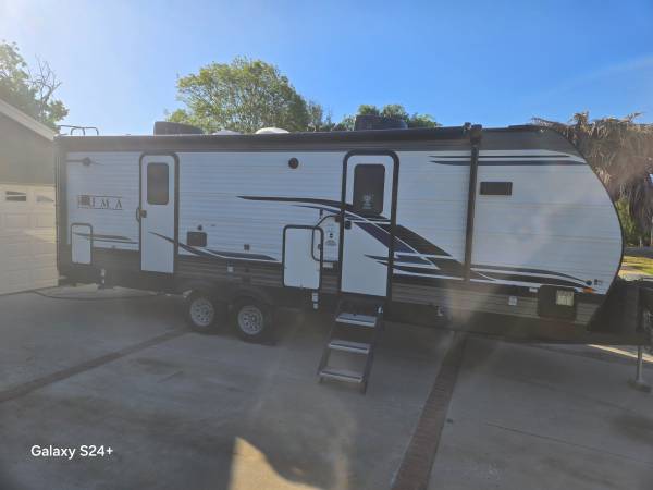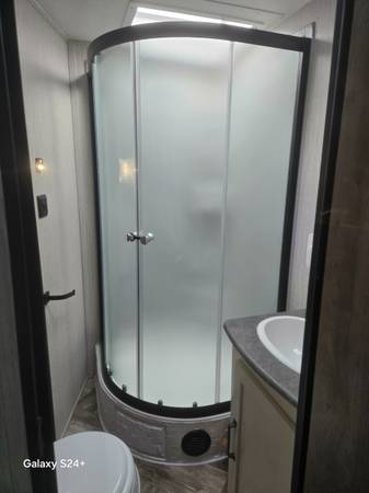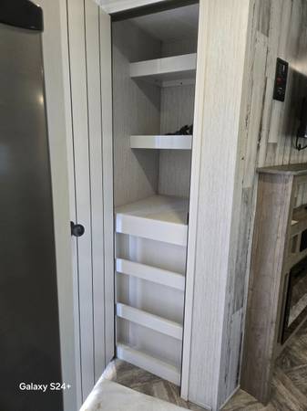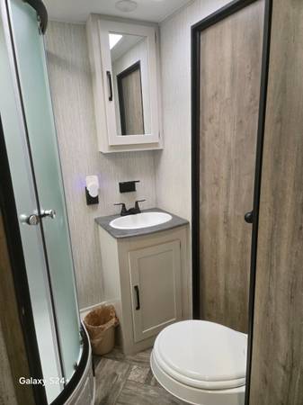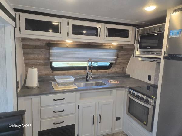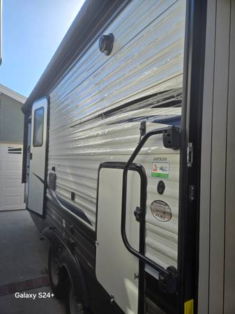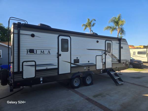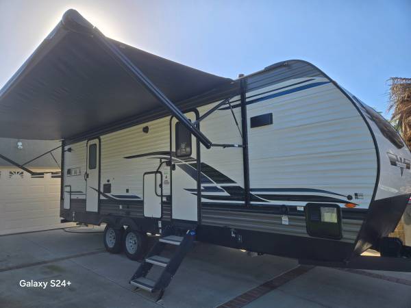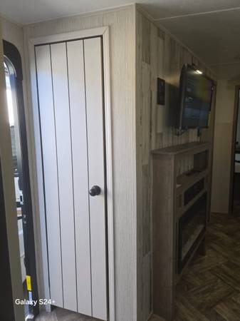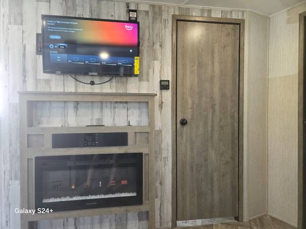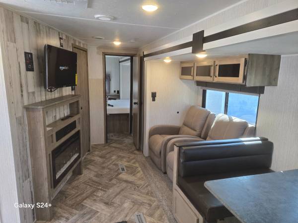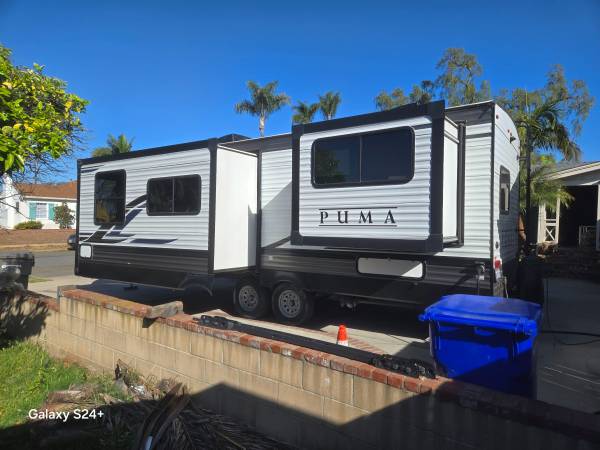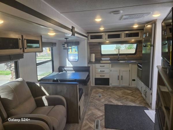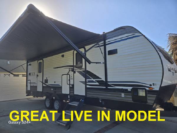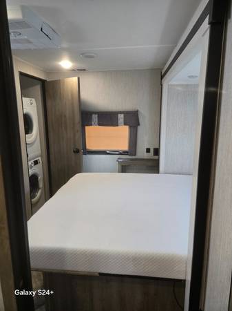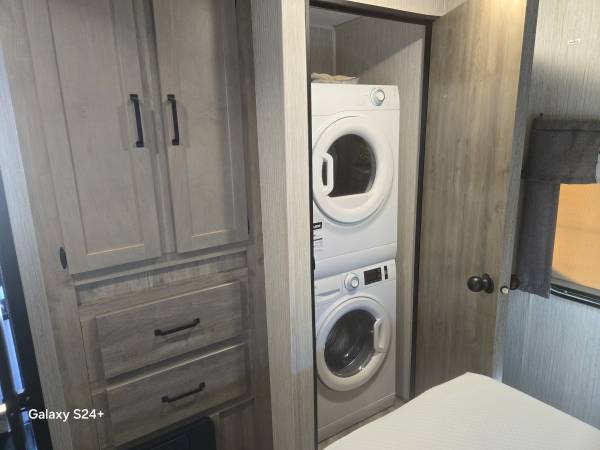 Ideal floorplan for a couple with or without live in intentions, with the trailer backed into the camping site puts the large kitchen in the front against traffic and the bedroom in the back away from the traffic noise. The living space slide offers a spacious living area with recliners, fireplace and television and the 2nd bedroom slide allowing for a spacious bedroom with its own entry door and its own bathroom door, lots of storage and also a washer and dryer.