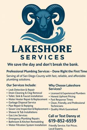 LAKESHORE SERVICES “We save the day and don’t break the bank.” ⸻ 🛠️ Professional Plumbing Services – Done Right the First Time Serving all of San Diego County with fast, reliable, and affordable...