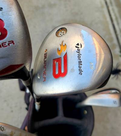 Taylormade Golf BURNER JR SET Jr Package Set RH Right Handed 4 Piece with Stand bag lightweight Golf 4-Way Slot Multicolor white black and red multiple pockets in good pre-owned condition with wear and light marks as pictured.